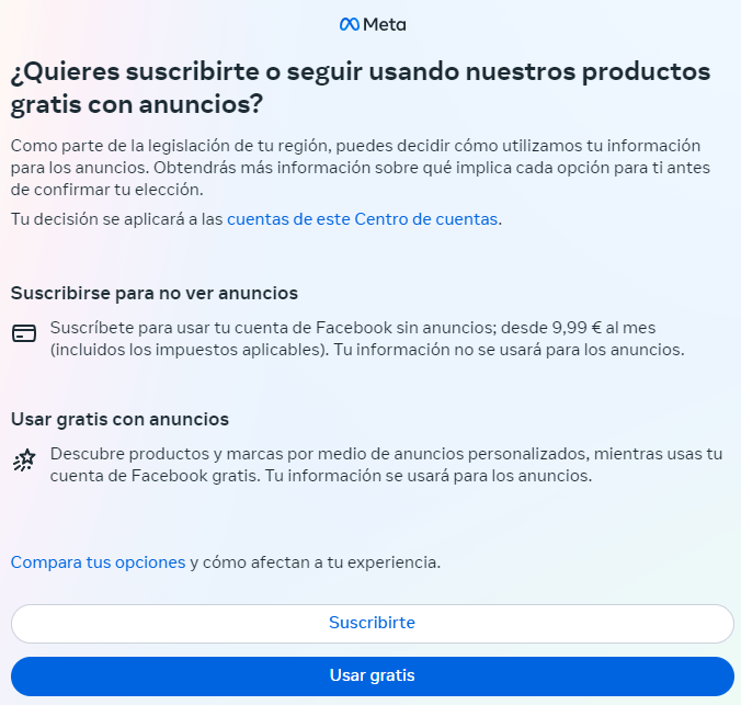 As a response to EU regulations (GDPR and DMA) Facebook proposed a paid subscription to Facebook and Instagram (by paying 9,99 €/month + 6€/month for each extra account of yours in Meta Account Center). These subscribers will enjoy ad-free services and Meta will not process their information for personalised advertising.
